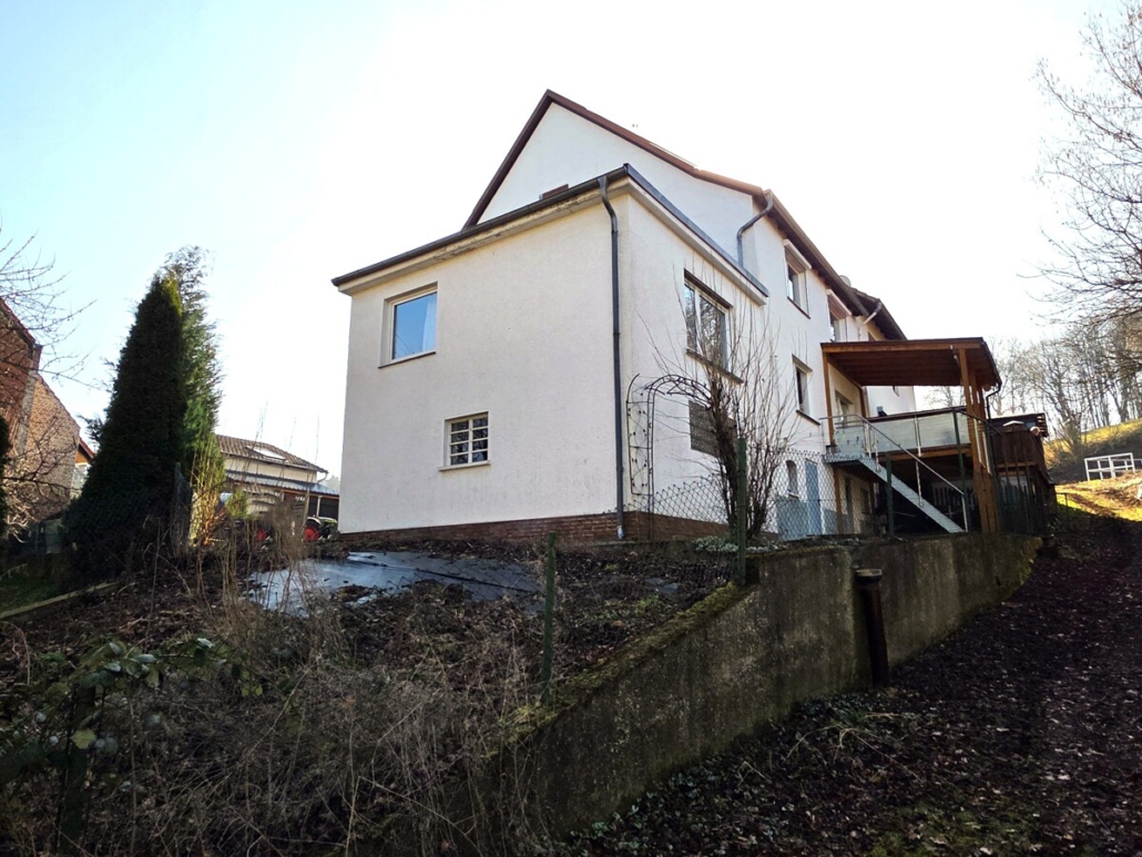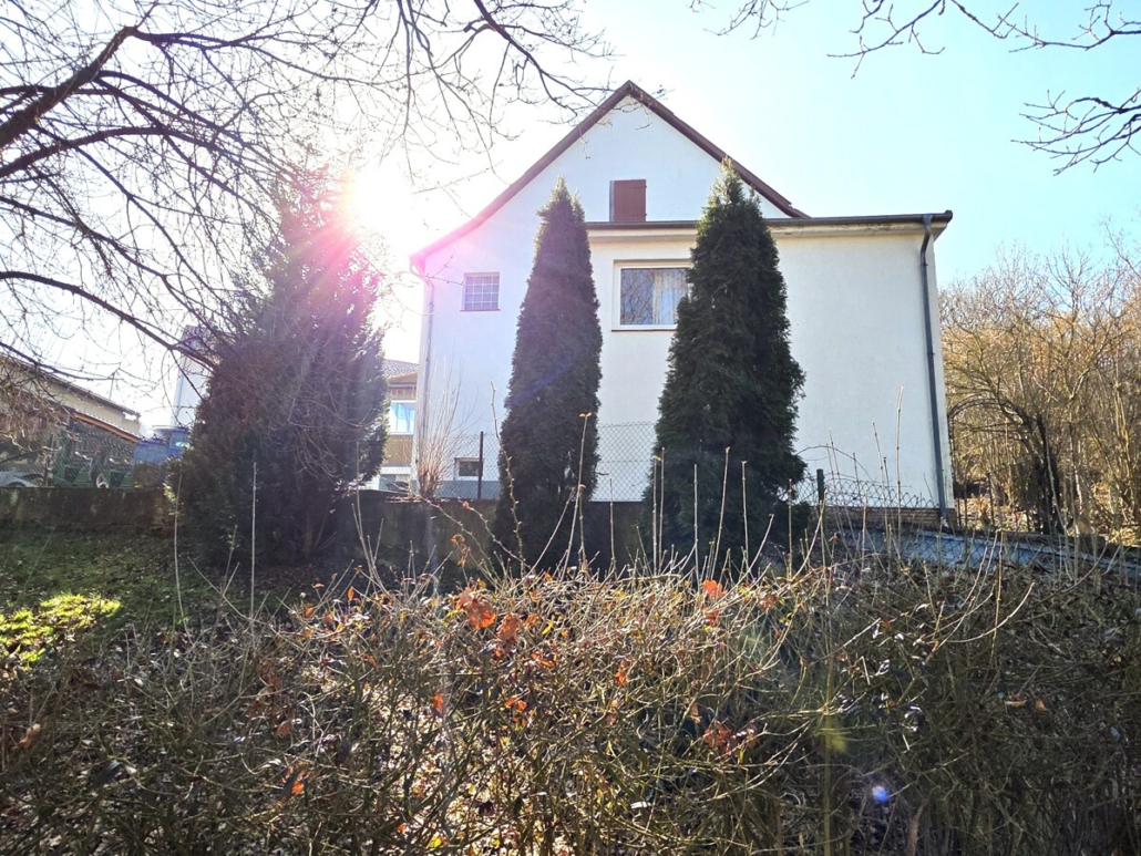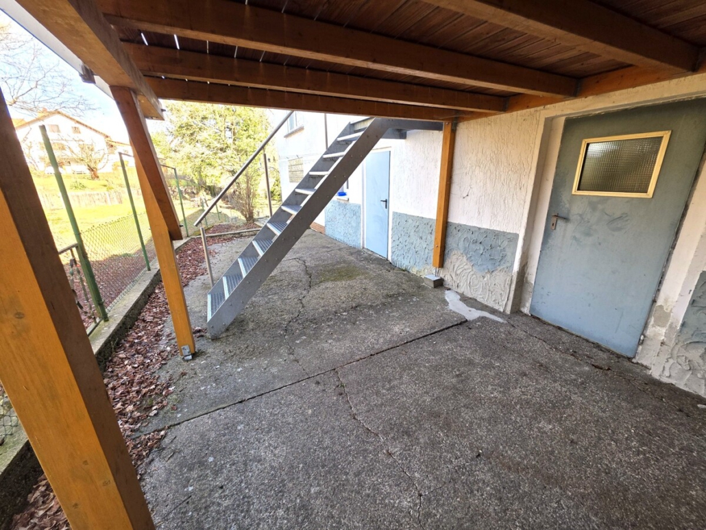 Derzeit ist das Haus in 2 Wohnungen aufgeteilt, die Erdgeschosswohnung bietet eine Wohnfläche von ca. 102m² mit einer großzügigen Küche mit Speiskammer, einem Tageslichtbad mit Badewanne, einem Schlafzimmer und einem Wohnzimmer mit anliegender Terrasse, die im Jahr 2019 angebaut wurde. Über eine Stahltreppe gelangt man von der Terrasse direkt aufs Grundstück.