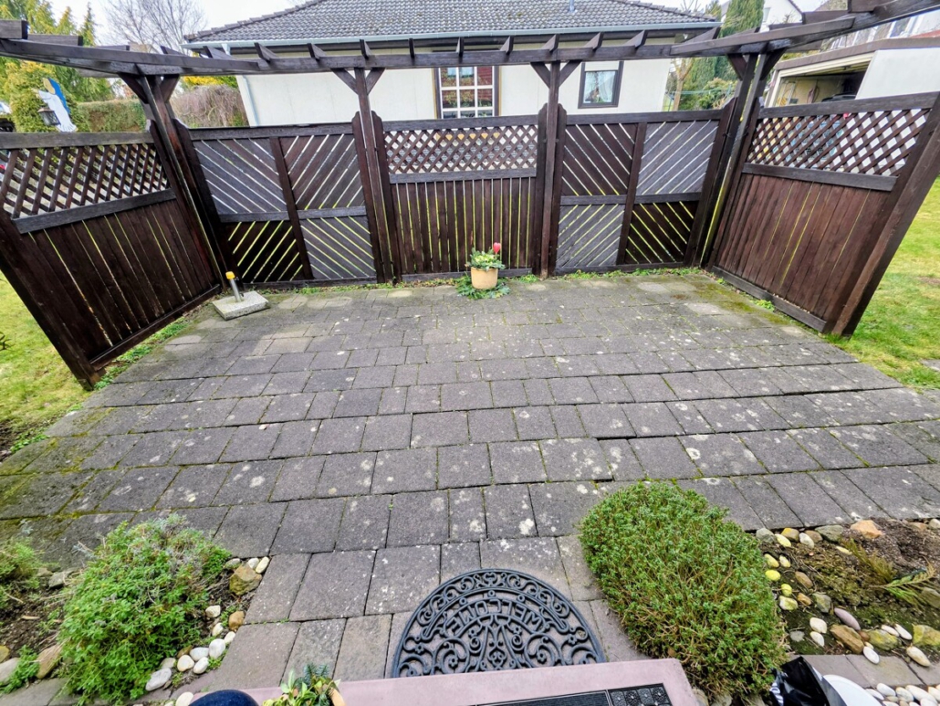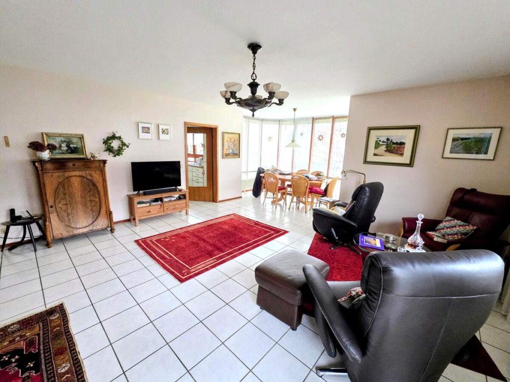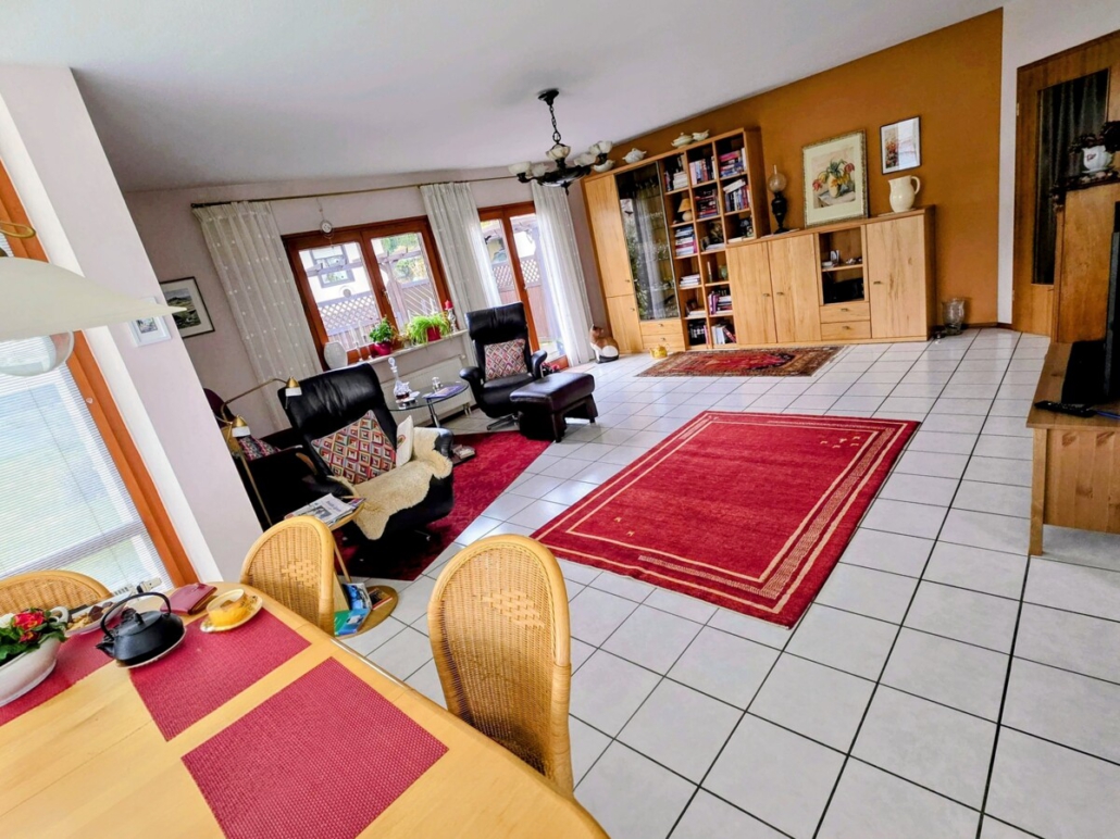 Man betritt das Haus über 5 Stufen einer Steintreppe und gelangt in den großzügigen Flurbereich. Linker Hand befinden sich ein Gäste-WC, eine Garderobe und im Anschluss das große Wohn-/Esszimmer mit Erkeranbau und Zugang zur Küche mit Einbauküche und mit Speisekammer. Vom Wohnbereich aus kann man auf die einladende Terrasse gelangen, die durch eine Sichtschutzwand einen gemütlichen, persönlichen Bereich bildet.