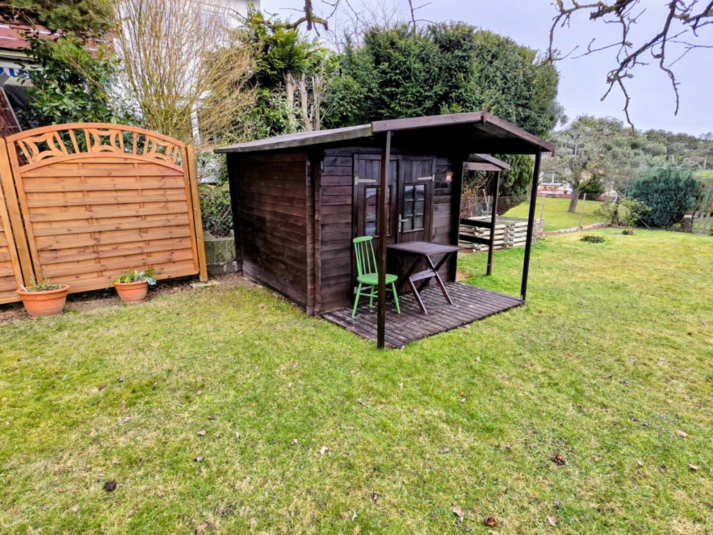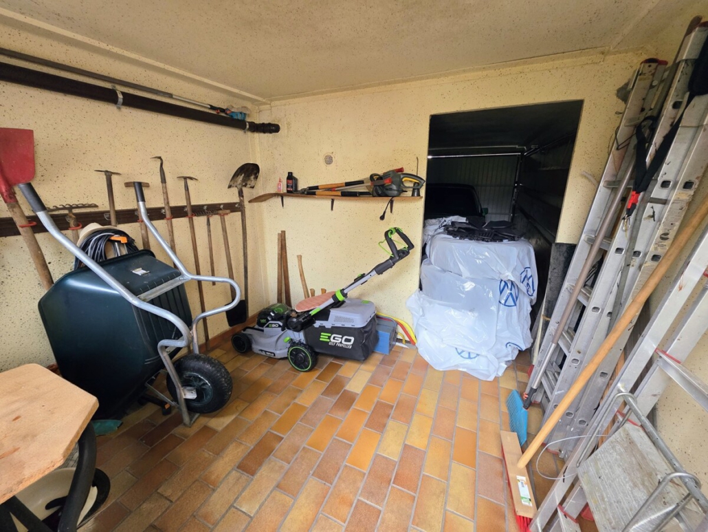 Eine große Einzelgarage mit Geräteraum rundet das Angebot ab.